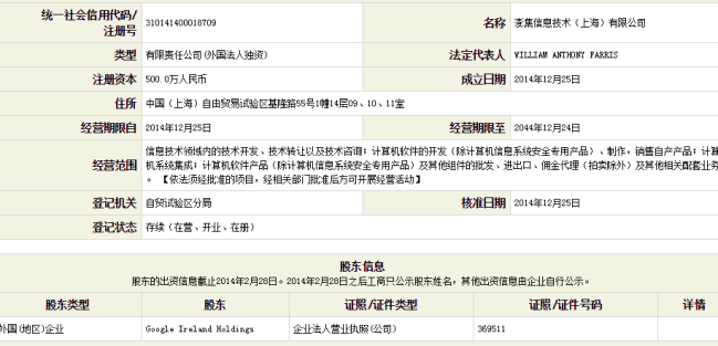 澎集信息成立于2014年12月25日,股東為Google Ireland Holdings(谷歌愛爾蘭控股),法人代表是William Anthony Farris,注冊資本為500萬元。該公司的經(jīng)營范圍包括:信息技術(shù)領(lǐng)域內(nèi)的技術(shù)開發(fā)、技術(shù)轉(zhuǎn)讓以及技術(shù)咨詢;計算機軟件的開發(fā)(除計算機信息系統(tǒng)安全專用產(chǎn)品)、制作,銷售自產(chǎn)產(chǎn)品;計算機系統(tǒng)集成;計算機軟件產(chǎn)品(除計算機信息系統(tǒng)安全專用產(chǎn)品)及其他組件的批發(fā)、進出口、傭金代理(拍賣除外)及其他相關(guān)配套業(yè)務(wù)。從澎集信息的經(jīng)營范圍上看,已經(jīng)涵蓋了谷歌此前撤出的業(yè)務(wù)內(nèi)容,包括網(wǎng)頁搜索和郵箱服務(wù)。歌或許期望,可以在上海自貿(mào)區(qū)享受“境內(nèi)關(guān)外”的政策,作為重返中國的第一步。